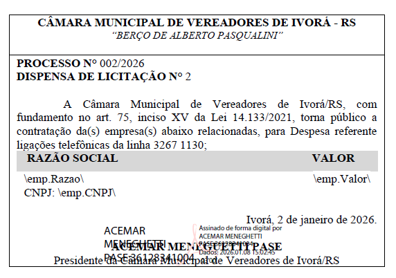 Saúdo presente a casa, vereador Acemar, saudando ele, saúdo a mesa diretor, colegas, vereador e vereadora. Eu desejo um excelente mandato para vocês, a nova mesa diretora, sendo sabedor que vamos cumprir a Constituição, o Regimento Interno e a Lei Orgânica. Isso é muito importante para a seriedade do nosso trabalho. E isso, com certeza, vai acontecer. Hoje eu fui questionado por várias pessoas sobre a farmácia do Posto de Saúde. Desde que estive na secretaria, conversei com a secretária, e ela me justificou que o período é curto das férias da responsável pela farmácia, da farmacêutica, e, daí, não conseguiu um profissional por um período tão curto para a contratação. Daí, através do consórcio, foi contratada outra pessoa, que atende dois municípios. Isso eu estou informando para a população. Ela atende de tarde no Ivorá e pela manhã em outro município. Não vou dizer o nome do município também, que não vai ser o caso. Isso, a questão do mérito que cada um julgue, foi essa a justificativa que ela me deu, e eu estou aqui repassando para as pessoas que me procuraram. Eu também gostaria de falar que Ivorá está sendo expandido pela grande quantidade de pessoas que vêm visitar. Esse final de semana, tanto sábado e domingo, tem bastante pessoas de vários lugares, isso é muito importante, porque essas pessoas também divulgam o nosso município, e quanto mais conhecido, é melhor. Para nós, o reconhecimento de fora e a gastronomia, com certeza, aumenta e o giro de dinheiro, sem falar nos empregos diretos e indiretos que tem. Um assunto principal que eu queria falar, eu acho que vocês, acontece, para vocês, o que está acontecendo comigo, das pessoas procurarem devido à morosidade e à demora da construção da nossa galeria na General Osório. Eu acredito que vocês são procurados também, os nossos colaboradores todos são procurados pelas pessoas questionando essa situação. Eu, amanhã, vou atrás do contrato, porque, em primeiro lugar, nós estamos aqui para representar as pessoas, e queira comercial, de bancos, é a principal rua que nós temos no município. Isso eu já estou achando uma falta de respeito com os moradores, com o município, de um modo geral, uma obra dessa envergadura já indo para oito meses. Começou em maio, está indo para oito meses e ainda não está sendo entregue. Nós temos também que pressionar o Poder Executivo, o nosso engenheiro, para que isso acabe. Mesmo porque, depois, quando lhes entregarem a obra, o município vai ter que fazer o calçamento, de onde foi arrancado o calçamento, daí é mais tempo ainda, não sei de que forma vai fazer, com certeza vai ser licitado e você sabe o prazo que você tem para uma licitação ser concluída. E agora eu quero fazer uma comparação. Você já viu uma obra de 7 milhões que está para acontecer aqui? Se cada 500 mil de despesa demora um ano, talvez só o Tiago vai poder passar, que é o mais jovem, nessas pontes. Como eu falei, está tudo morto, não está pronto as pontes se continuar com essa morosidade de fazer uma obra pública. Eu acho que nós, vereadores, como representantes, nós temos sim que cobrar, não interessa... Todo cara que fica bravo vai se estressar sozinho se for cobrado. O cara tem que fazer a nossa parte de representação. Não podemos se encolher. Nós estamos defendendo o cidadão e agora vão dizer que tem passagem provisória, que já tem gente falando que quase arrancou o cano de descarga. Eu acho que nós temos que pressionar, é muita obra em andamento que tem que ser concluída. É como eu falei, eu vou ver o contrato, porque eu não posso acreditar que nesse contrato está oito meses para entregar uma obra dessas. Para isso, muito obrigado, e quero dizer para as pessoas que me cobram, que eu vou continuar cobrando aqui, porque nós temos sim que buscar o melhor bem-estar para a população, porque aí tem farmácia e tem consultório, e vai poeira para dentro. Tem um consultório odontológico aí. E vai poeira porque a obra tem que ser concluída e a gente tem que fazer o calçamento. Vocês viram que tem um consultório ao lado? Um consultório odontológico. Então eu, sem falar nas outras possibilidades, nós temos que continuar cobrando. Eu não tenho medo do engenheiro, não tenho medo de ninguém. Se eu tiver que cobrar, eu vou cobrar, e acabou a conversa. Era isso, meu muito obrigado.